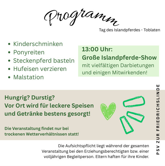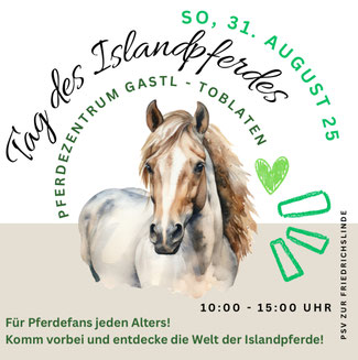 Freut euch auf ein tolles Programm rund ums Islandpferd für Groß und Klein. Kommt vorbei, bringt Freunde und Familie mit! Auch wird für Speis und Trank bestens gesorgt sein! 🍕🍔🥤 Wir freuen uns auf viele Besucher! ❤️✨.